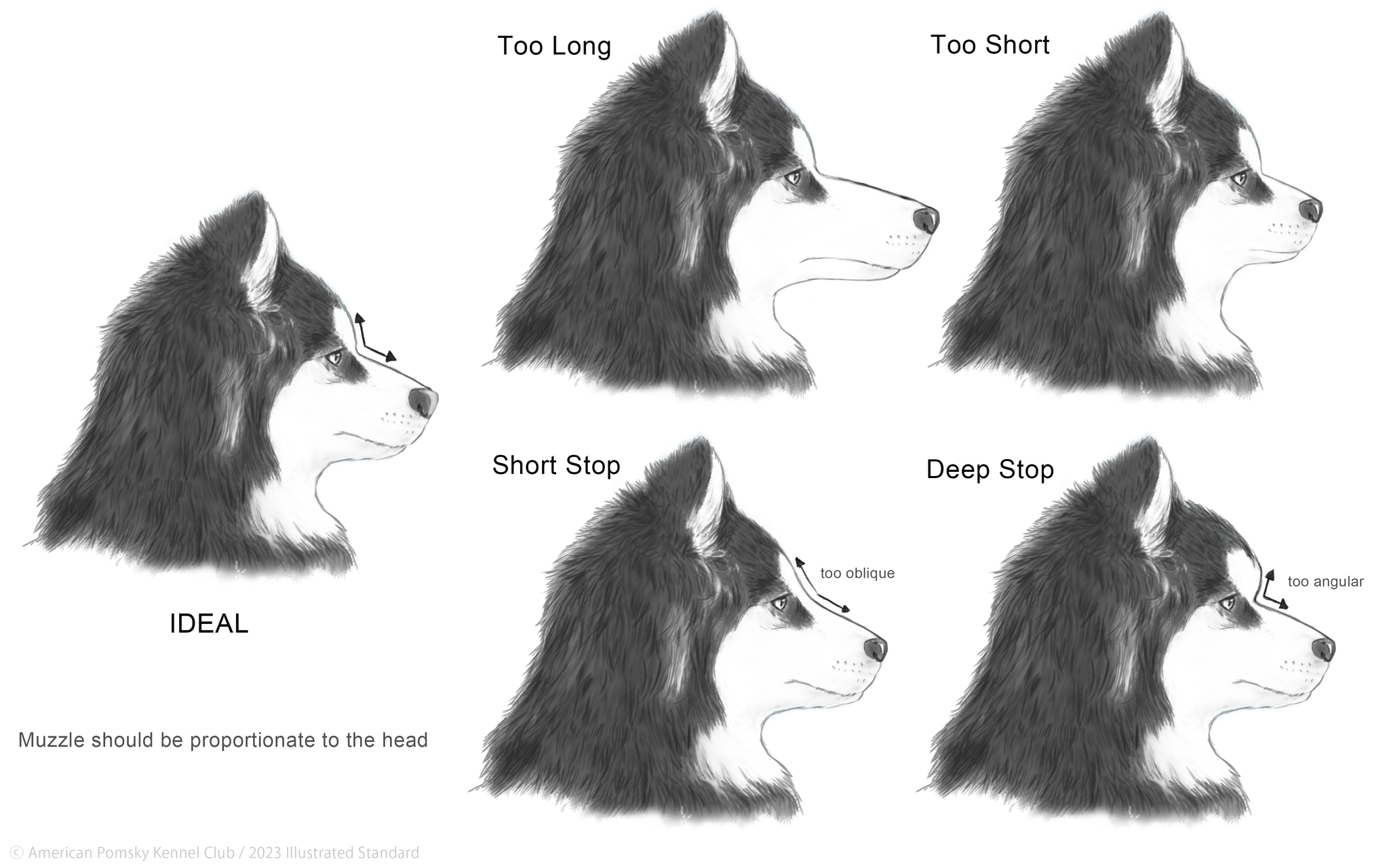 POMSKY MUZZLE of medium width, tapering gradually to the nose, with the tip neither pointed nor square. Muzzle of medium length equal to about 1/3rd of the head; that is, the distance from the tip of the nose to the stop is equal to the distance from the stop to the occiput.