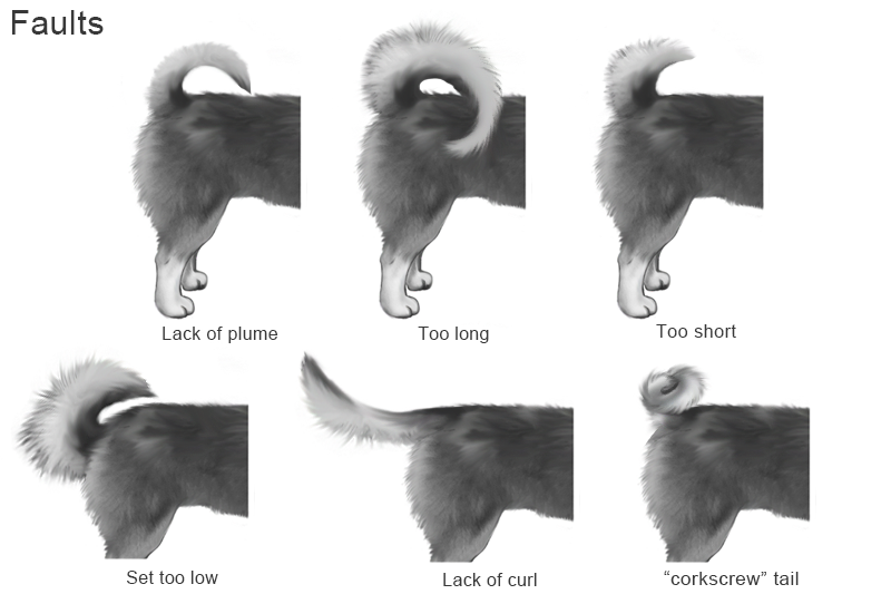FAULTS - Tightly curled “piggy” tail. Not well-furred tail. Hanging or tucked tail. Sitting too high or too low on the body. Lack of plume, lack of curl or too short/long.