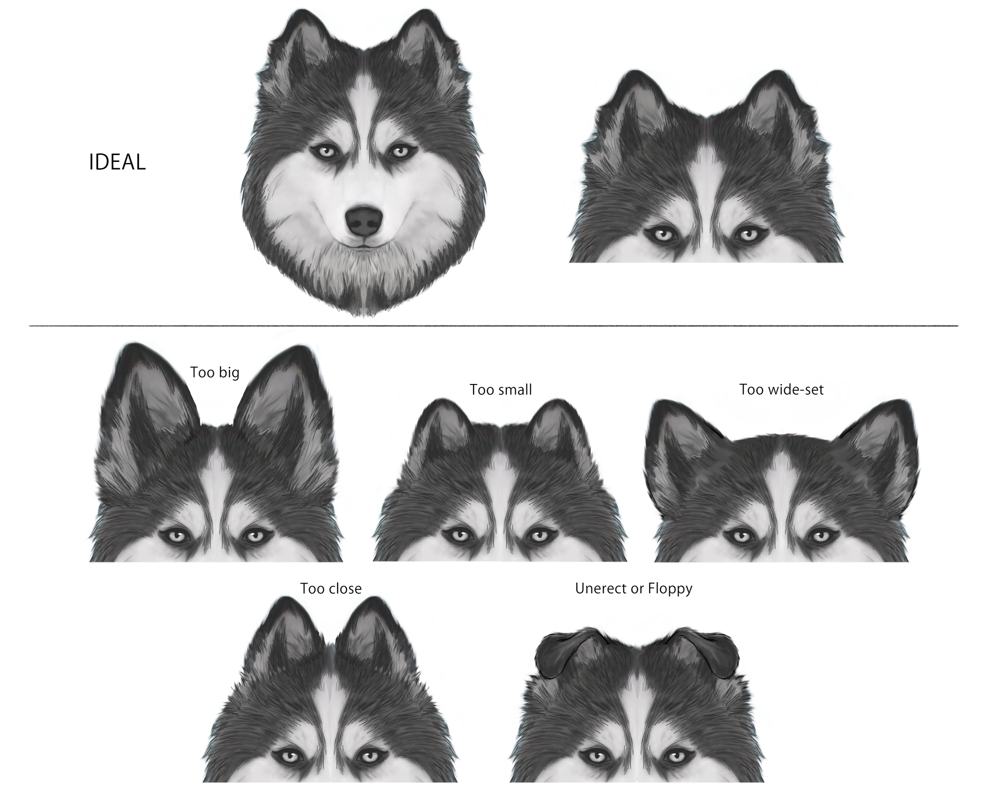 FAULTS: Ears too large in proportion to the head, too wide or low set on the head, or not strongly erect.