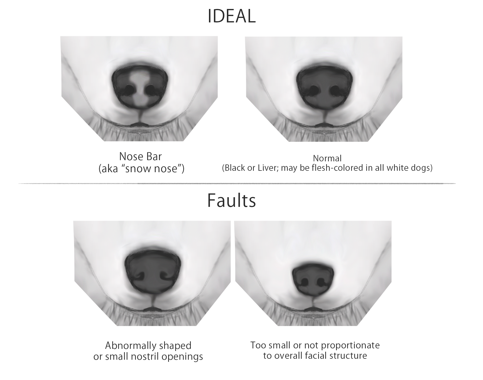 POMSKY NOSE is black in gray, tan, or black dogs; liver in chocolate and sable dogs; may be flesh-colored in pure white dogs. Snow nose/nose bar can be seasonal and is acceptable in Pomskies.